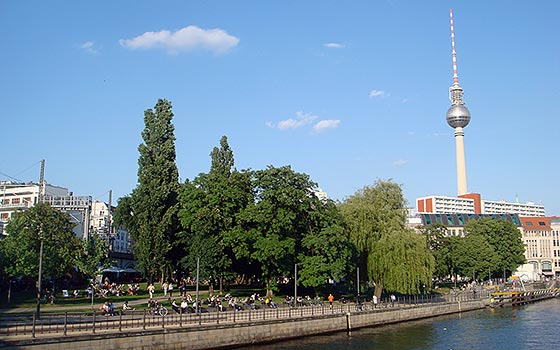 Richtung Osten: Berliner Dom, Fernsehturm, Nikolaiviertel, Marstall, Mühlendammschleuse, Radialsystem V, Energieforum, East-Side-Gallery, Mercedes-Benz Arena, Oberbaumbrücke, Osthafen, Universal, nhow-Hotel, Coca-Cola-Zentrale, MTV, Label 1 und 2, Badeschiff der Arena Treptow, Molekule Man; zurück zum Start und weiter Richtung Westen: Museumsinsel mit Alter Nationalgalerie und Bodemuseum, Monbijoupark, Schiffbauerdamm, Tränenpalast, Parlaments- und Regierungsviertel, Hauptbahnhof, Haus der Kulturen der Welt; außerdem: unzählige Brücken und viele Strandbars.